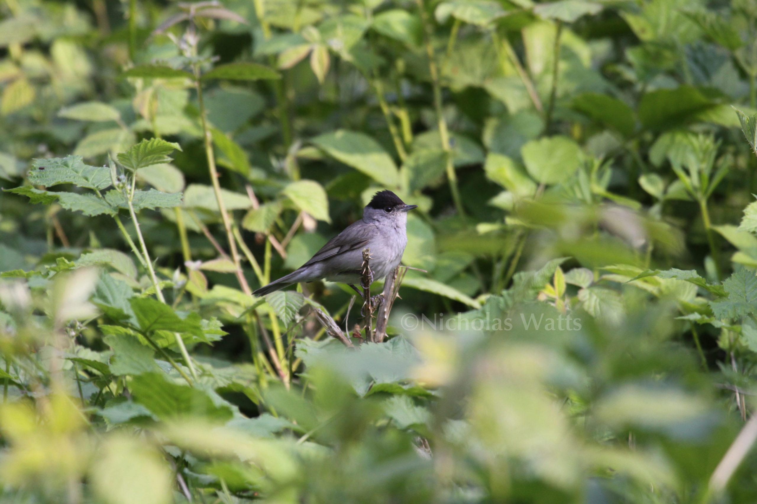 The Blackcap is a small bird in the warbler family, with the male having the black cap and a greyish under body with a brownish-grey back, grey wings and a grey tail, while the female has a chestnut brown cap and a brownish body. The song is a delightful warbling sound, albeit not terribly tuneful.