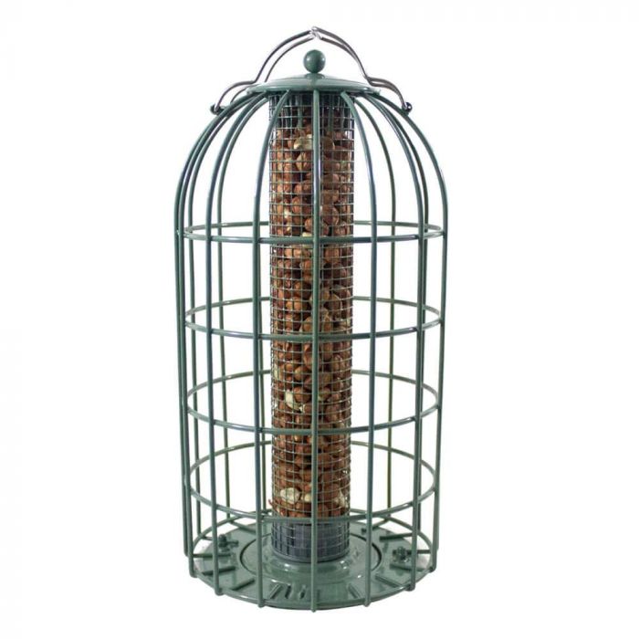 The squirrel-resistant Nuttery Caged Peanut Feeder is made from heavy gauge steel to stop squirrels and larger birds such as jackdaws, magpies and rooks from accessing the peanuts. The principle by which this caged peanut feeder works, is that the spaces in the cage are wide enough to let small birds like blue tits in, but not wide enough to give squirrels and larger birds access. It’s a simple and tried-and-tested design, which works well and is very effective. Dimensions of the squirrel proof peanut feeder are 36cm high and 16cm wide.