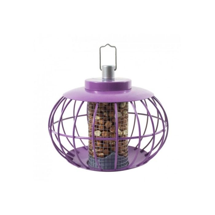 A squirrel and large bird proof peanut feeder, made from aubergine coloured coated steel.