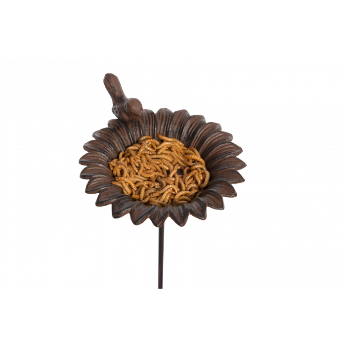 In the style of a sunflower, this feeder dish can be used for feeding seeds and live mealworms, as well as water
