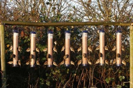 The four ingredients for attracting Tree Sparrows are: a pond, a hedge with many species of bushes in it, a feeder with red millet next to the hedge and other insect rich habitat nearby.